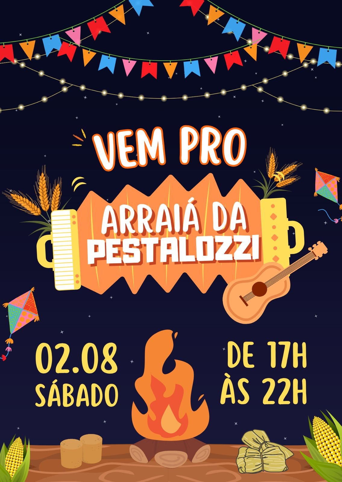 No próximo sábado, 2 de agosto de 2025, das 17h às 22h, acontecerá o Arraiá da Pestalozzi e vai ser em frente a sede da associação.