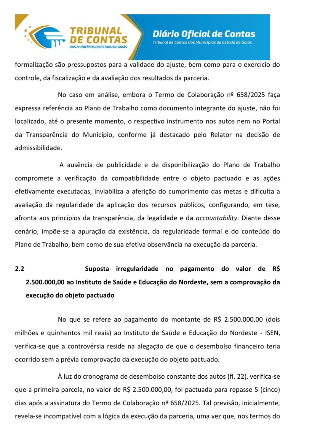Agora, um novo e grave episódio vem à tona. Trata-se de uma representação encaminhada ao Tribunal de Contas dos Municípios (TCM) pela Corregedoria da Polícia Federal, que notificou supostas irregularidades no Termo de Colaboração nº 658/2025, celebrado pelo município de Águas Lindas de Goiás, por intermédio do Fundo Municipal de Educação, com o Instituto de Educação e Saúde (ISEN) — uma entidade privada sem fins lucrativos.